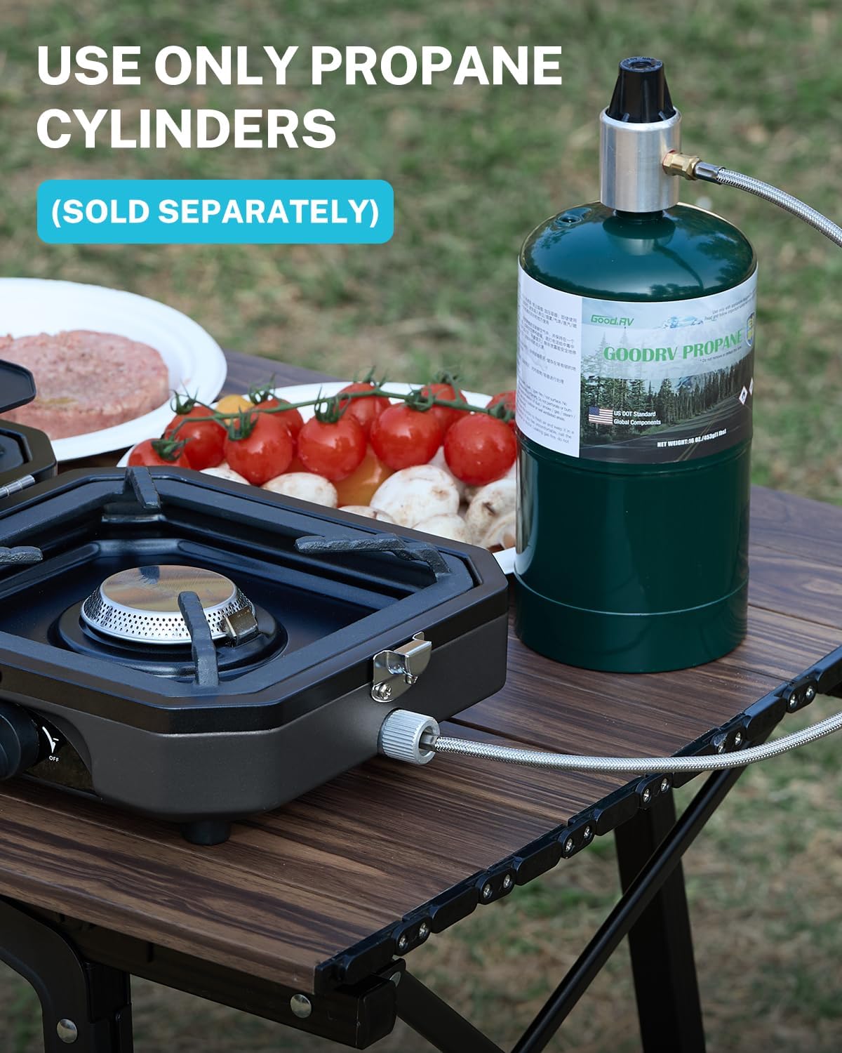 This 2 Burner Propane Camping Stove folds up for easy transport. With its compact 9.4” x 9.4” x 5.5” size and 6.6 lb weight, you can carry it in your backpack or store it in a small space. Also, it has a built-in handle for quick setup. The set includes the stove, a Teflon-coated griddle, two cast iron grill grates, and a propane hose (propane cylinders sold separately).