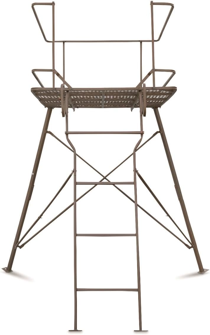 With a 6′ height to the shooting rail, this hunting stand provides excellent visibility and elevation. Moreover, the 48″ x 48″ platform comfortably fits two hunters. The 26″ height from platform to shooting rail ensures accurate aiming while remaining discreet.