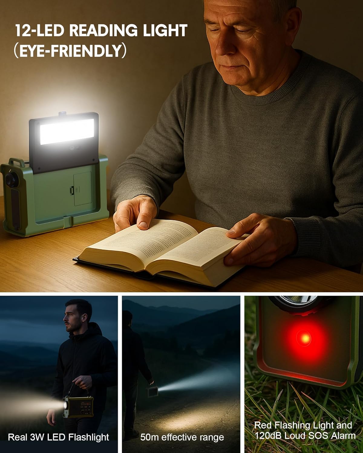 This Emergency Weather Radio with Solar also works as a reliable survival tool. A powerful 3W LED flashlight lights up dark areas during power outages or nighttime emergencies. Meanwhile, a foldable 2.5W reading lamp provides steady light for camping, repairs, or indoor use during blackouts.