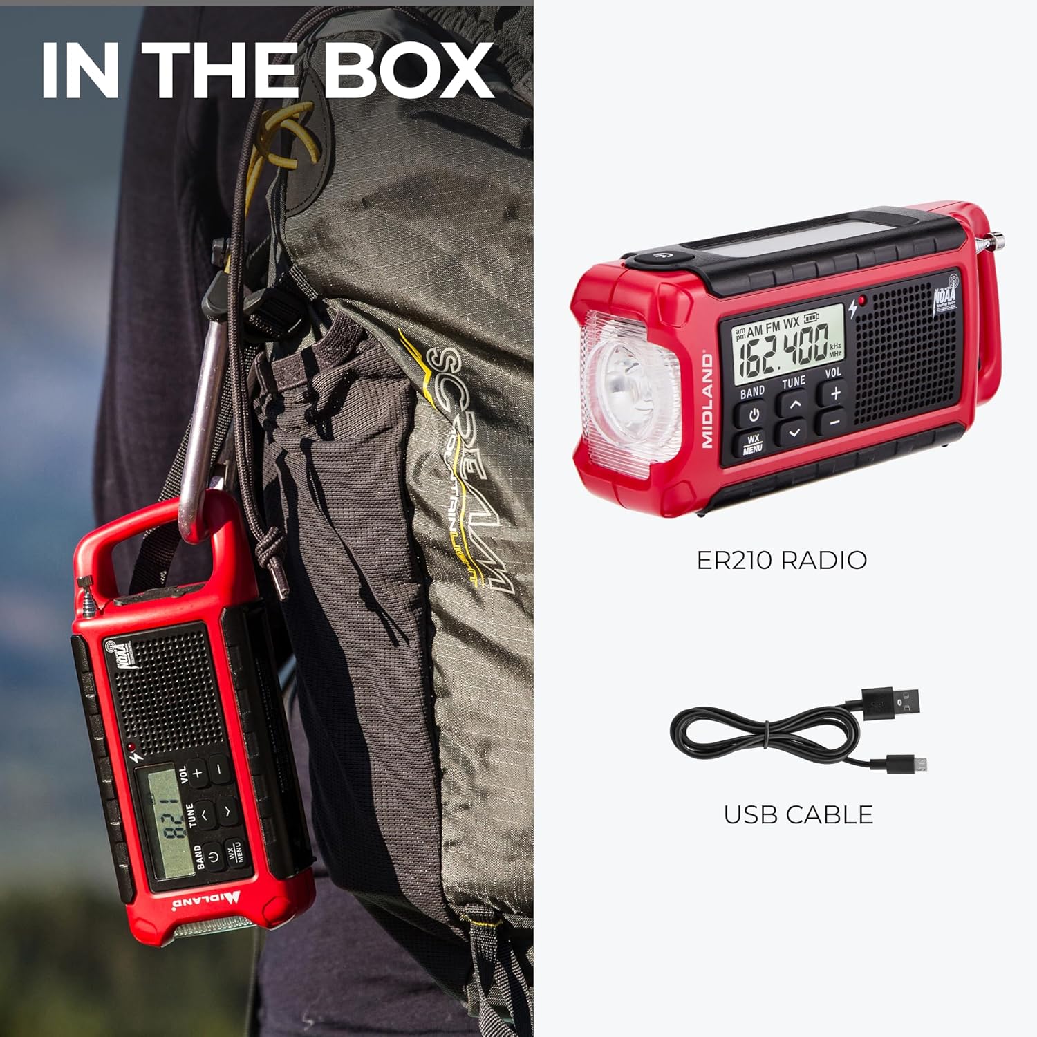 Charge your devices using the included USB charging cord. Also, monitor weather, time, and radio stations on the large backlit LCD display. Because of these features, the Midland ER210 ensures you stay connected, safe, and prepared wherever you go.
