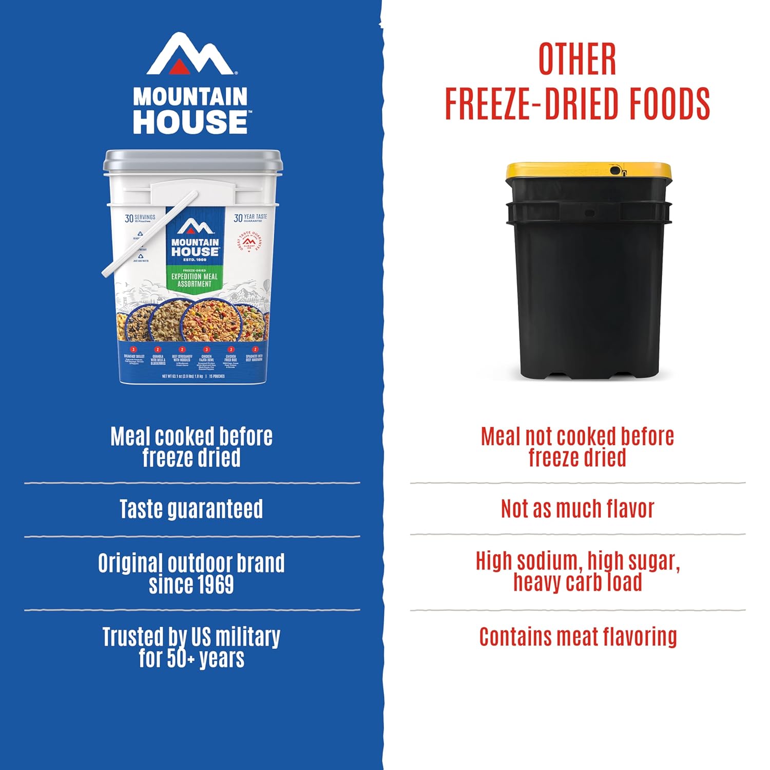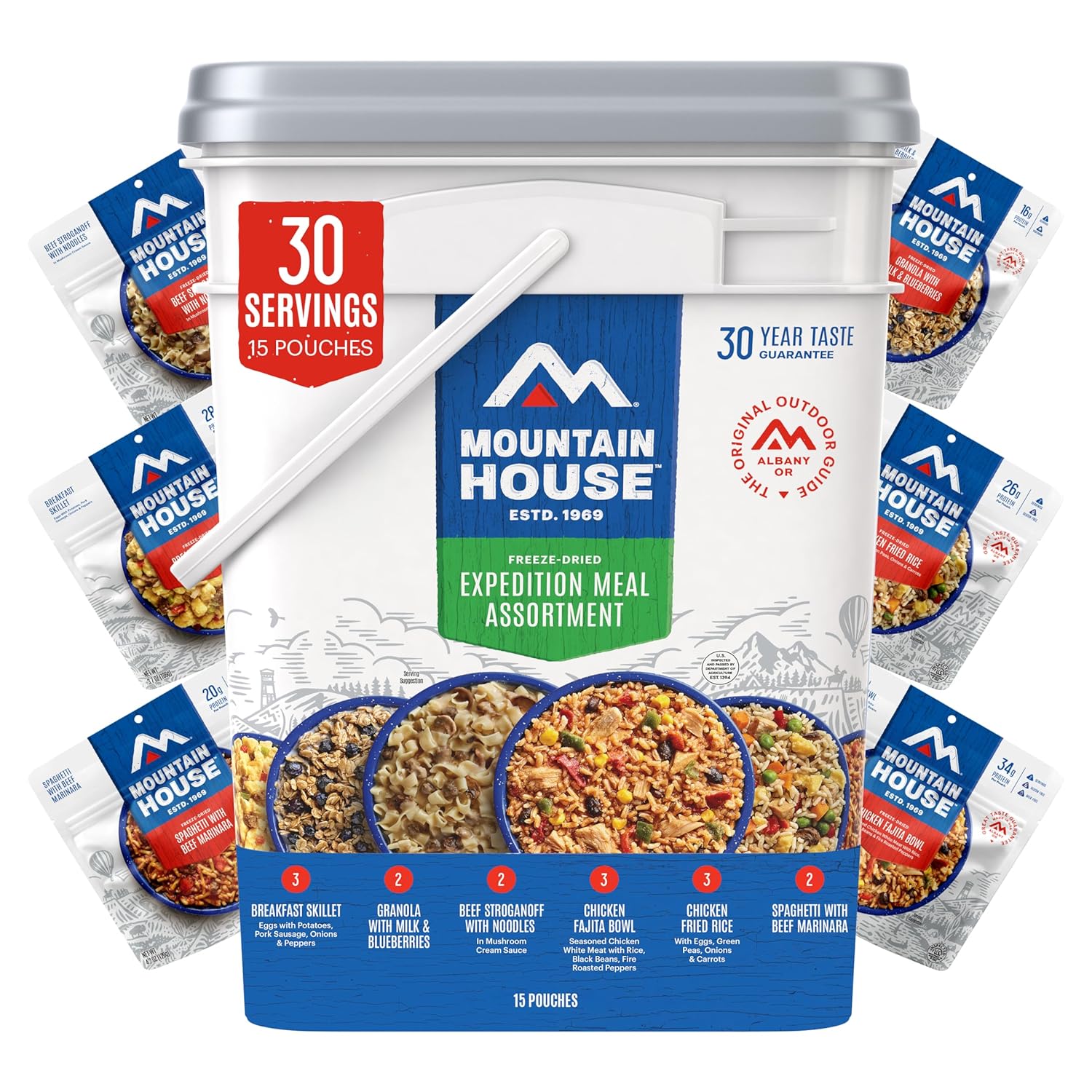 Each meal uses high-quality ingredients with no fillers or artificial flavors. The bucket contains 15 pouches (30 servings total):